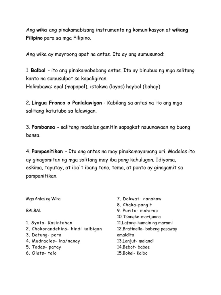 Learn vocabulary terms and more with flashcards games and other study tools. Ang mga iskolar ng panitikan at lingguwistika ay nagkaroon ng paghahati o mga kategorya batay sa kung anong antas ng wika ang ginagamit sa araw-araw na pamumuhay ng ating lipunan. Ang mga salitang balbal ay mga salita na madalas nating maririnig sa mga kalye o sa mga kabataan.
