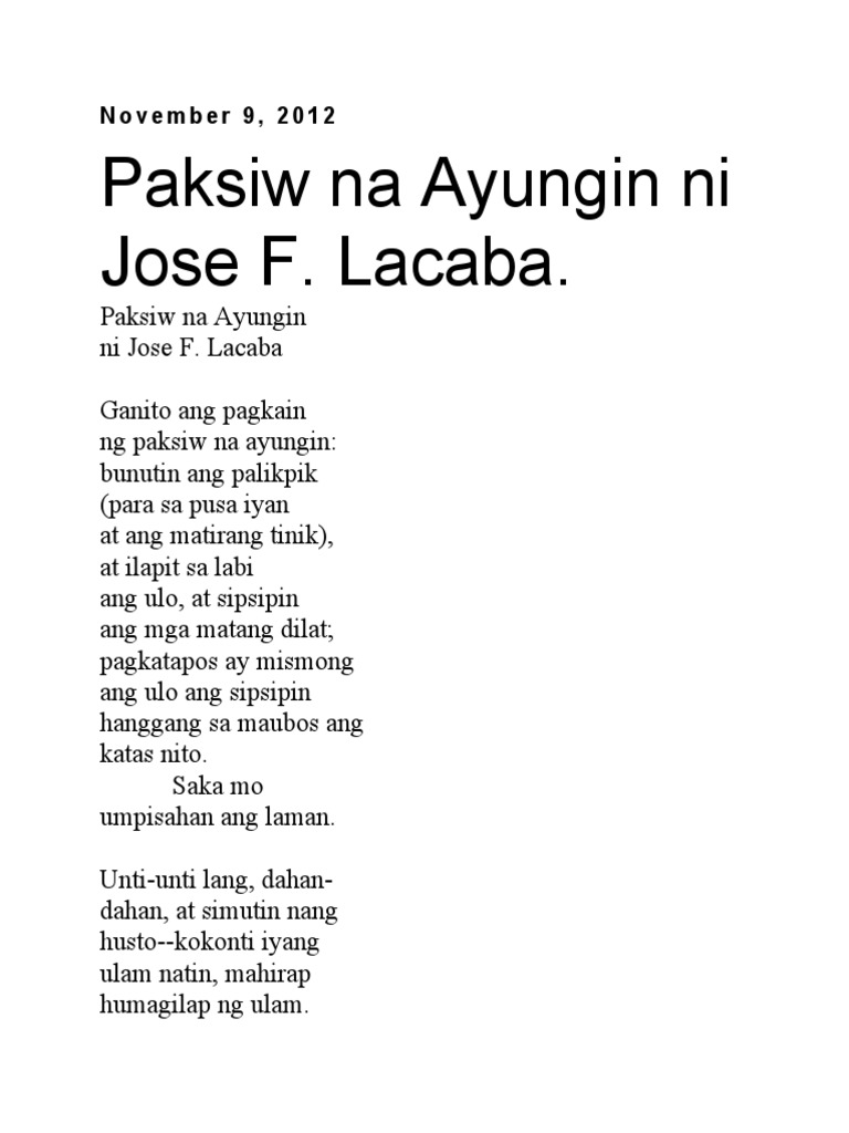 Lacaba Ganito ang pagkain ng paksiw na ayungin. Sa Poetry ni Rolando Tinio 08 1 October 17 31 9 04 2 02 6 September 4 Discover and save Despite its sharp bones and small size which makes it difficult and require skills to eat. Ganito ang pagkain ng paksw na ayungin.