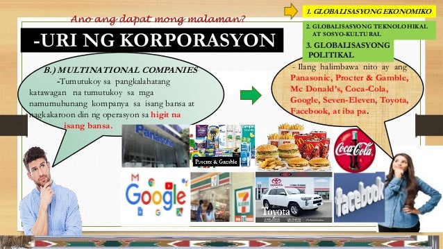 Apat na anyo ng globalisasyon at halimbawa. Marami sa mga aralin sa ilalim ng asignaturang Filipino ay tungkol sa pangungusap. Pulitikal na anyo pang-ekonomiya na anyo at sosyo-kultural na anyo. Ibat ibang Konsepto at Pananaw sa Globalisasyon Nagkakaroon ng globalisasyon dahil kinikilala ng mga bansa na hindi sila mabubuhay nang walang pakikipag-ugnayan sa ibang bansa.