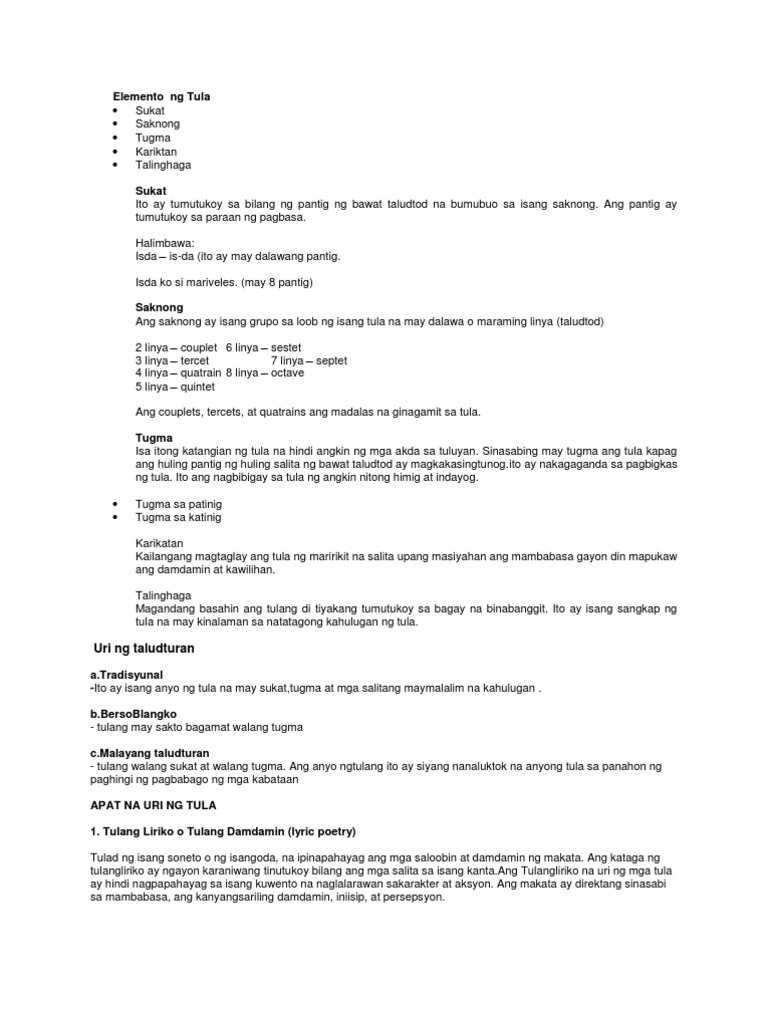 7202017 Tula na may tatlong saknong at apat na taludtod - 757917 Ang panulaan o tula ay isang uri ng sining at panitikan na kilala sa malayang paggamit ng wika sa ibat ibang anyo at estiloPinagyayaman ito sa pamamagitan ng paggamit ng tayutay. Ito ang ilan sa mga obserbasyon ni Almario 2006. Subalit ang dalawang elemento ng tula na ito ay magkaiba.
