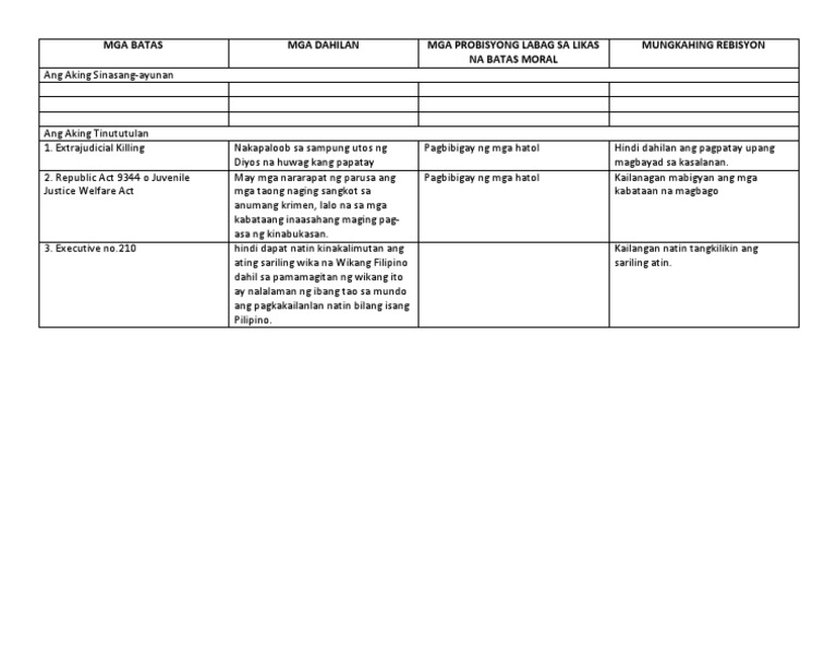 Mga Batas Mga Dahilan Mga Probisyong Labag sa Likas na Batas Moral Mungkahing Rebisyon Ang Aking Sinasang-ayunan 1 2 3 Ang Aking Tinututulan 1 2 12. Isulat sa unang hanay ang mga natutuhan mo tungkol sa Likas na Batas Moral. May pagkakaiba ba ang Likas na Batas Moral sa ibang Kultura.