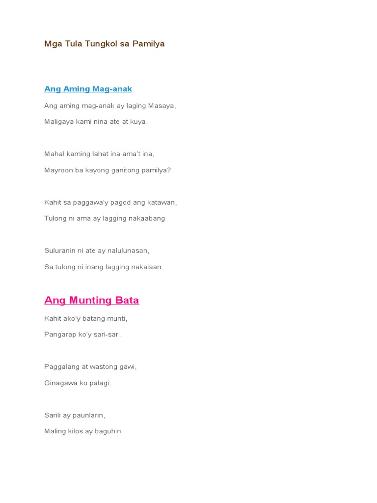 Ang mga sumusunod na tula tungkol sa pamilya na inyong matutunghayan ay hango sa ibat ibang karanasan ng mga sumulat. Poem about about family poem about rain. 02122019 TULA TUNGKOL SA PAMILYA Sa paksang ito babasahin natin ang mga ibat ibang halimbawa ng mga tula tungkol sa pamilya.