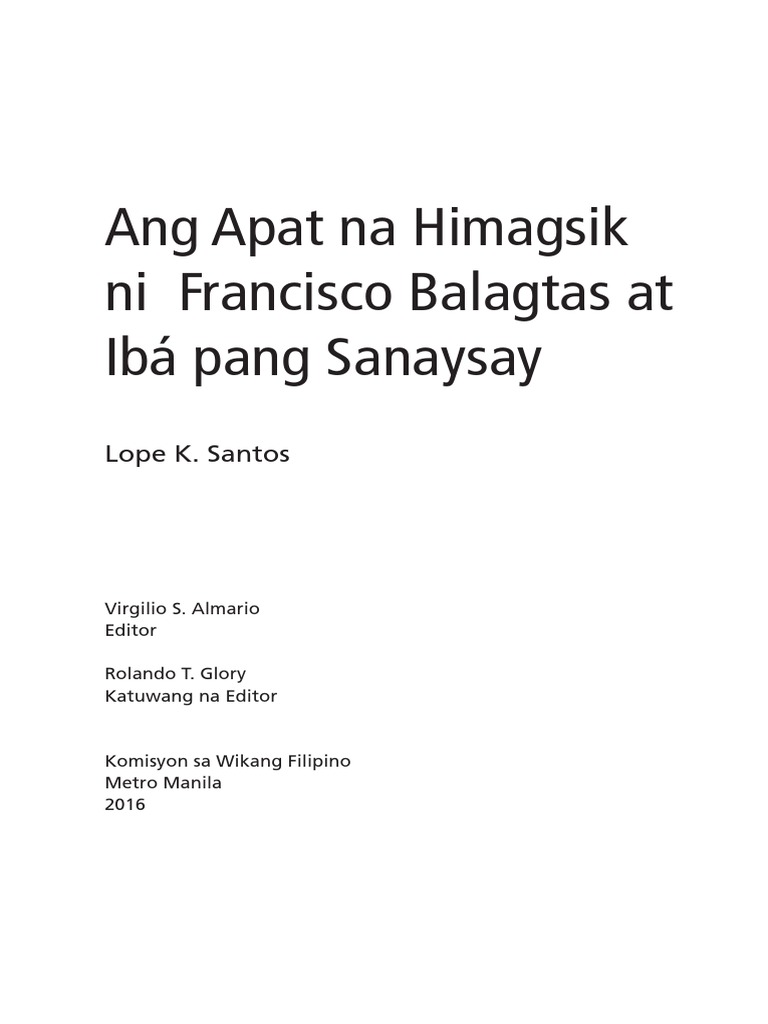 Ang Apat na Himagsik ni Francisco Balagtas at Iba pang Sanaysay editor Almario Virgilo S. Santos analysis of the literary masterpiece titled Apat na Himagsik ni Balagtas he names revolt against a cruel government as the very first on the list. Ang apat na himagsik ni Francisco Balagtas at iba pang sanaysay Normal view MARC view ISBD view Ang apat na himagsik ni Francisco Balagtas at iba pang sanaysay Lope K.