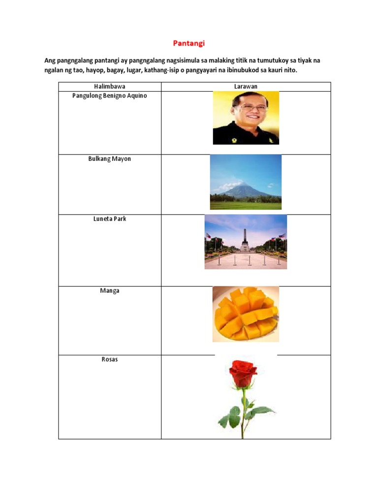 Pantangi - tumutukoy sa tiyak na ngalan ng tao bagay hayop pook pangyayari at iba pa. Itim ang kulay ng. The worksheets are easy enough so I did not include answer keys.