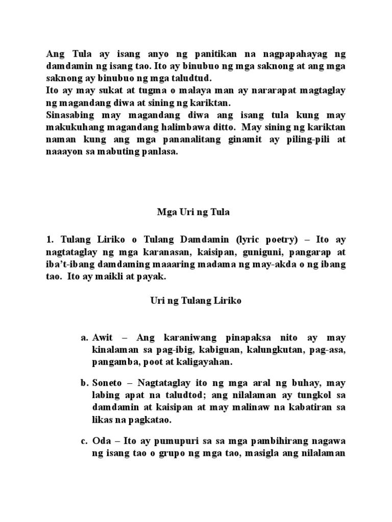 Pumapaksa ito sa isang kaisipan o damdamin na kapupulutan ng aral. Read Mga Uri ng Tulang Liriko from the story Grade 10 Filipino Module by fckdmpd Gwyneth Antonio with 44293 readsHi guys. G10 Module -- Filipino.