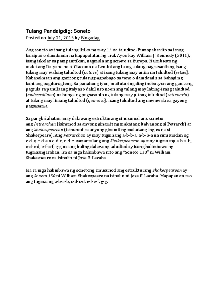 Soneto Ano Ang Soneto Itoy Tulang Liriko Na Binubuo Ng Labing Apat 14 Na Taludturan Na Hinggil Sa Damdamin At Kaisipan Itoy Nakikilala Sa Matinding Course Hero. Kennedy 2011 isang iskolar sa pampanitikan nagmula ang soneto sa Europa. Ang soneto ay hindi basta tula lamang na binubuo na labing-apat na taludturan.