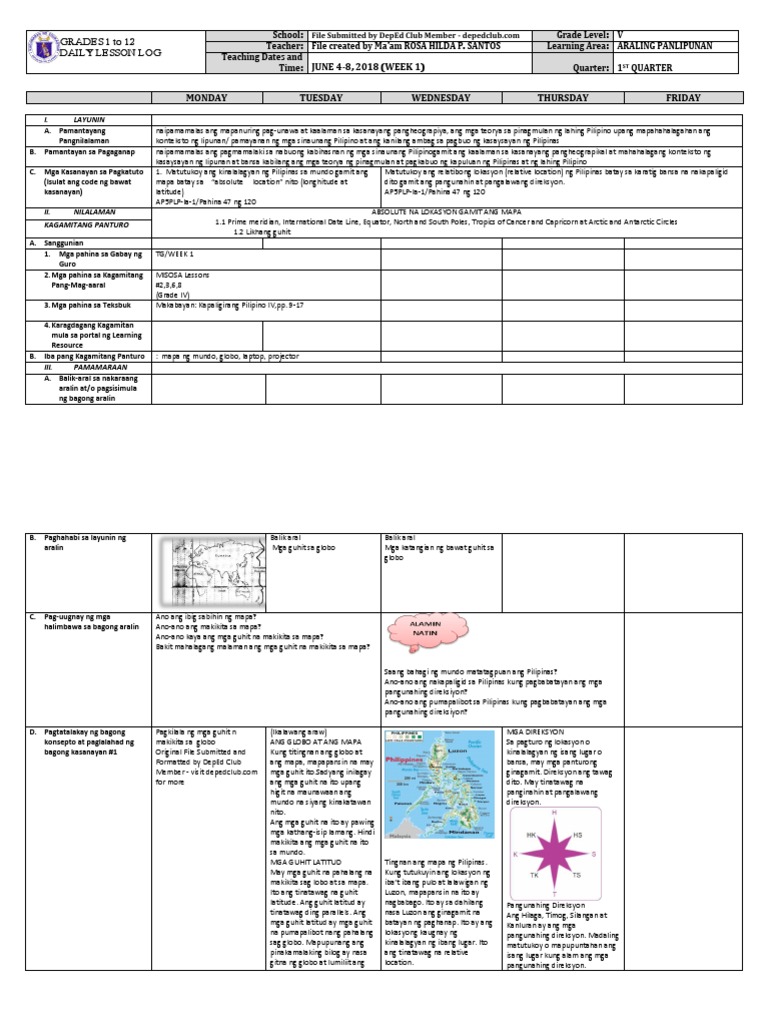 Sa mga polo nagtatagpo ang mga meridian. ANG GLOBO AT ANG MAPA Kung titingnan ang globo at ang mapa mapapansin na may mga guhit itoSadyang inilagay ang mga guhit na ito upang higit na maunawaan ang mundo na siyang kinakatawan nito. Ang ekwador ang bahagi na pinakamalapit sa araw kung kayat mainit sa panig na ito ng daigdigLatitud - ito ang mga guhit na paikot sa globo na kahanay ng ekwador.