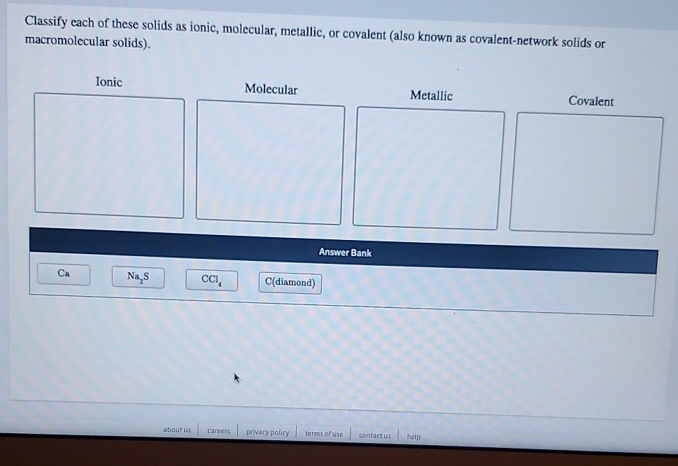 Is na ionic molecular metallic or covalent. Solids may be formally classified as ionic molecular covalent network or metallic. Learn vocabulary terms and more with flashcards games and other study tools. Covalent crystals are composed of atoms which are covalently bonded to one another.
