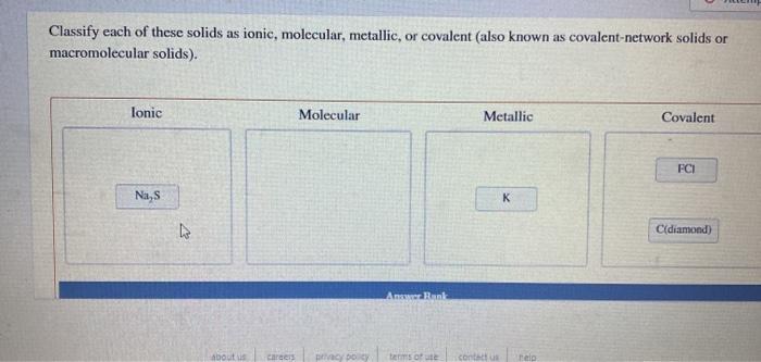 Composed of a metal and a nonmetal as ions. 2822018 Were being asked to classify each solid as ionic molecular metallic or covalent. Bond Energy is higher than that of metallic bonds.